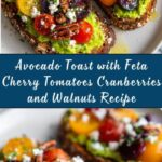 If you crave a breakfast or snack that’s bursting with flavor, texture, and vibrant colors, this Avocado Toast with Feta, Cherry Tomatoes, Cranberries, and Walnuts Recipe is about to become your new obsession. Creamy avocado mashed with a hint of lemon sits atop perfectly toasted sourdough, while juicy cherry tomatoes, tangy feta, sweet cranberries, and crunchy walnuts create a harmonious melody of tastes and mouthfeel. It’s simple yet sophisticated, nourishing yet indulgent, and a feast for your senses that you can whip up in just 15 minutes.