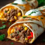 - Fill Tortillas: Lay a large flour tortilla flat on a clean surface and spoon about 1/3 cup of the beef and cheese mixture into the center of it.