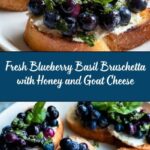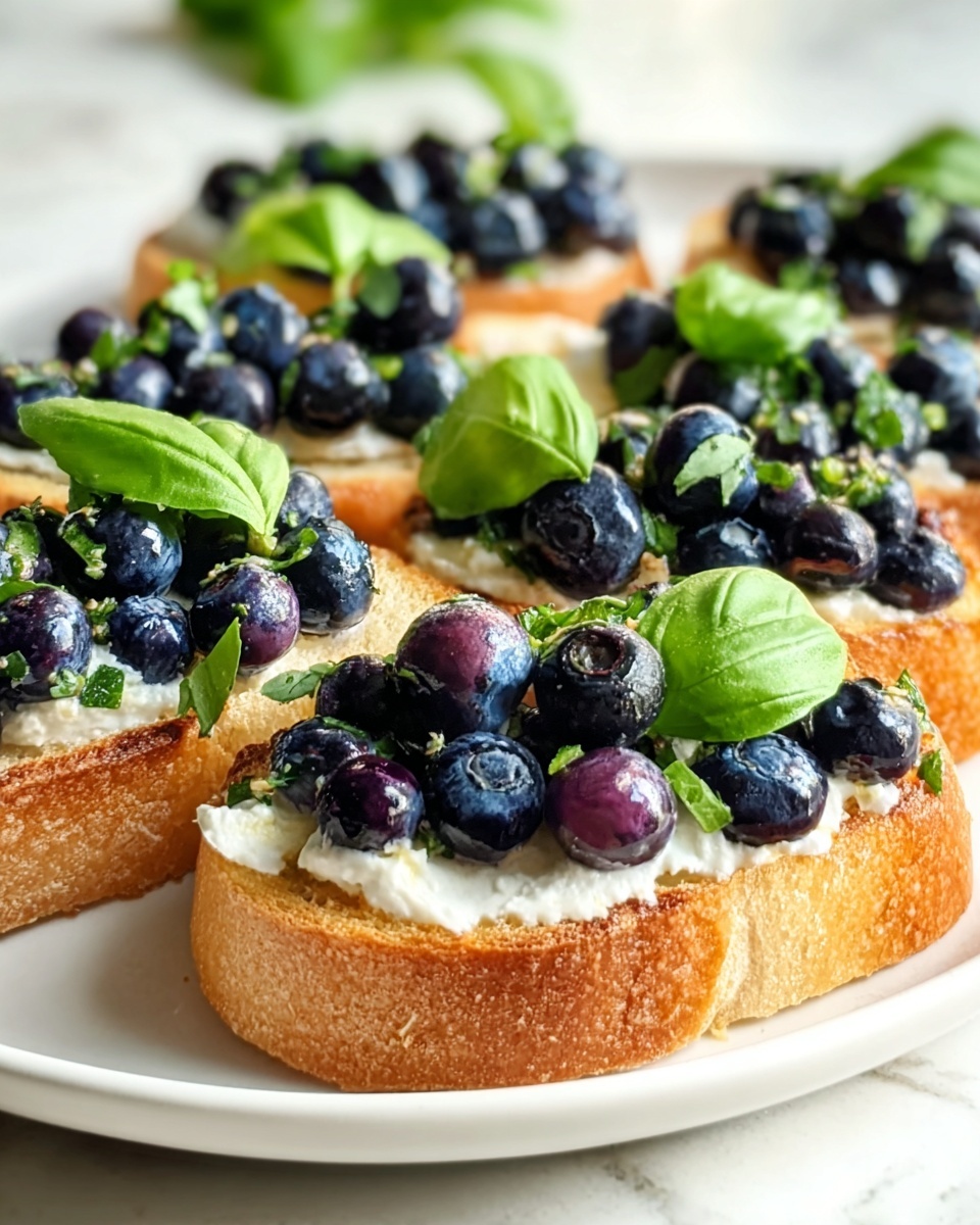 This Blueberry Basil Bruschetta is a fresh and vibrant appetizer perfect for any occasion. Crisp toasted baguette slices are layered with creamy goat cheese, juicy blueberries, fragrant fresh basil, and finished with a drizzle of sweet honey and a dash of salt and pepper, creating a delightful blend of sweet, savory, and herbal flavors.