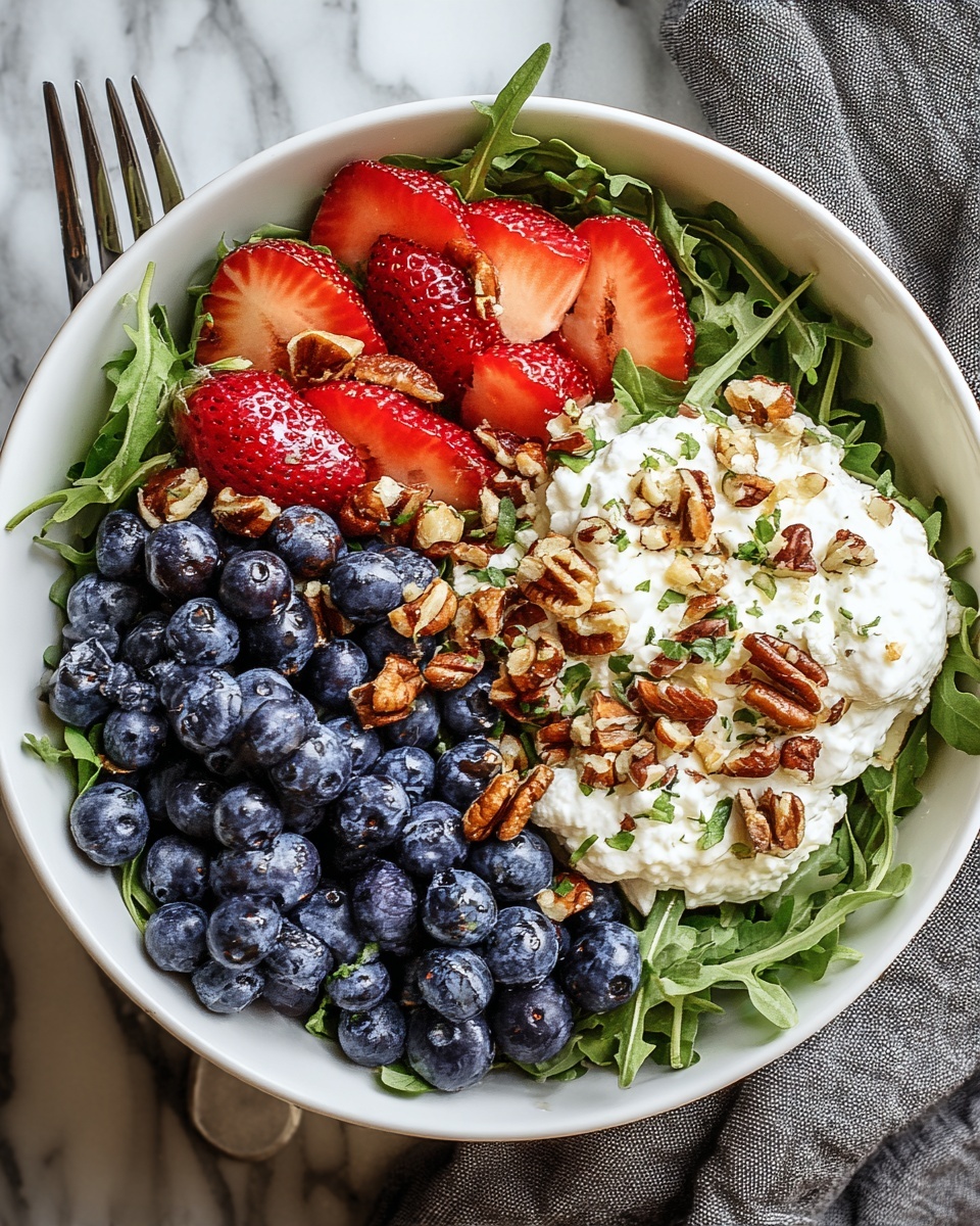 This salad shines brightest when fresh. Serve it straight away to enjoy the combination of crisp greens, juicy berries, creamy yogurt, and crunchy nuts in perfect harmony.
