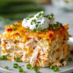 This Cheesy Buffalo Chicken Lasagna with Ranch Drizzle combines spicy buffalo chicken with creamy ricotta, mozzarella, and Parmesan cheeses layered between tender lasagna noodles. Baked to perfection and topped with a cool ranch drizzle and fresh green onions, this flavorful dish offers a spicy, cheesy twist on classic lasagna that serves 6 in about 50 minutes.