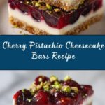 Delight in these luscious Cherry Pistachio Cheesecake Bars featuring a buttery graham cracker crust, creamy cheesecake filling swirled with cherry pie filling, and topped with crunchy chopped pistachios. Perfectly baked to a golden edge and chilled to set, these bars offer a harmonious blend of tart cherries and rich cheesecake in every bite.