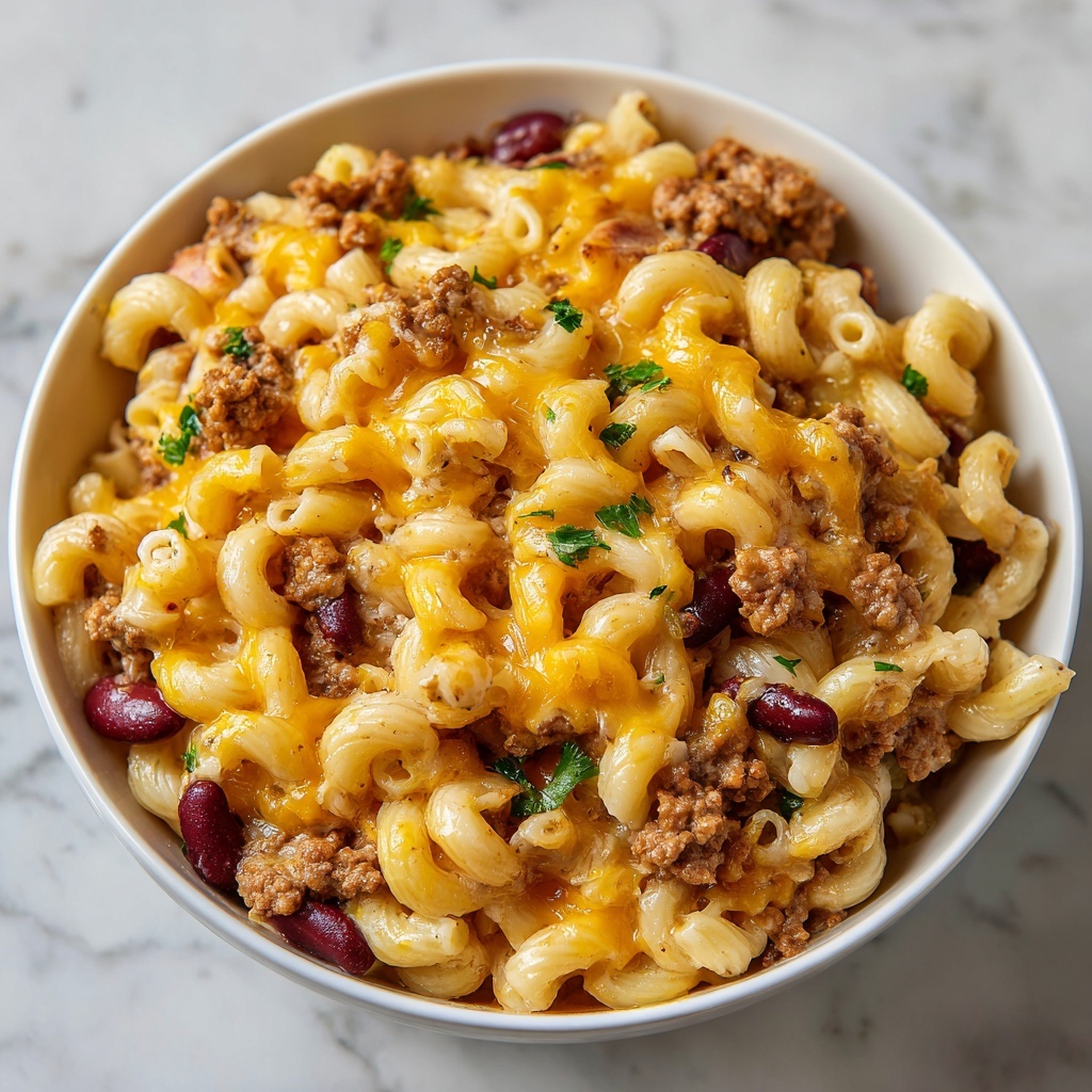 Now carefully fold the simmered chili mixture into the cheesy macaroni, combining everything gently so the textures remain distinct yet harmonious. This combination brings the best of both worlds into every forkful.