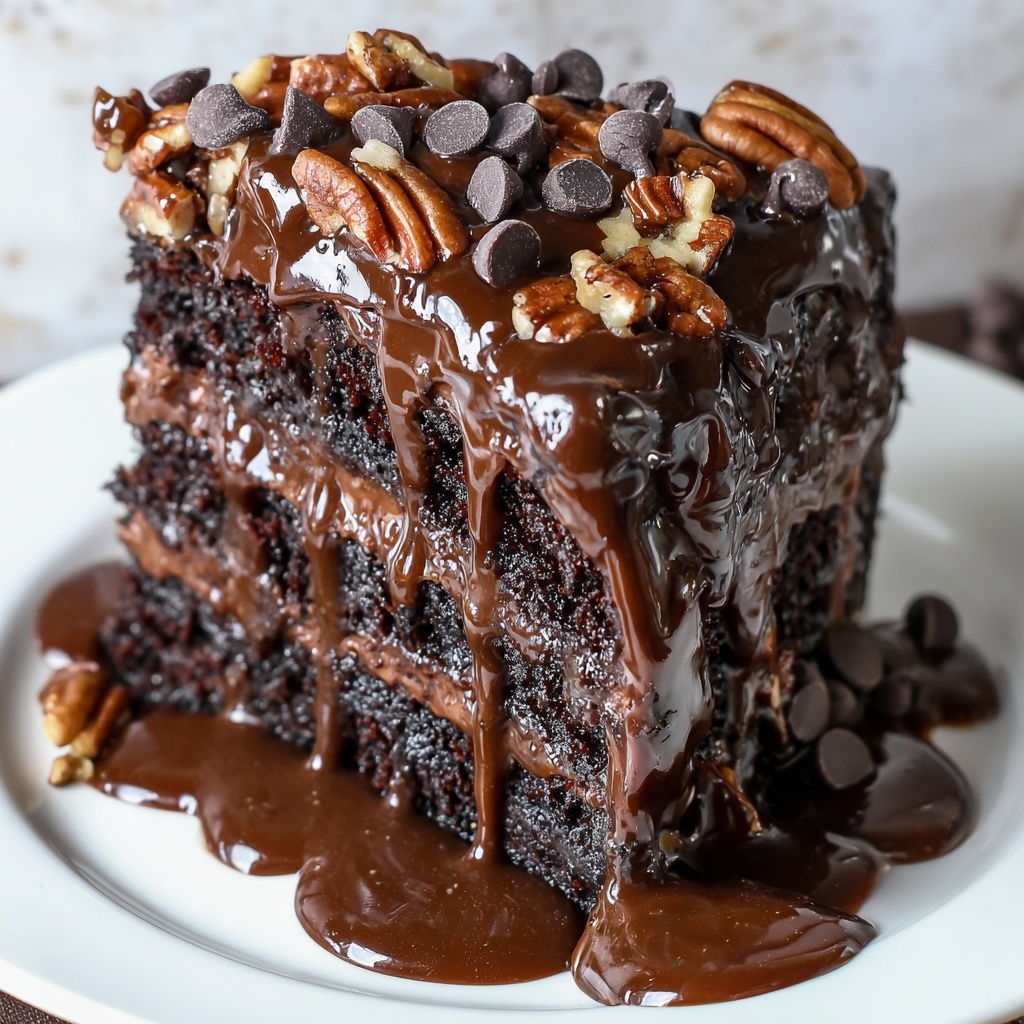 - Add Toppings: Let the cake cool slightly to set the layers. Drizzle caramel sauce and chocolate sauce over the top for extra sweetness and shine. Garnish with additional pecans if desired. Slice and serve warm or at room temperature.