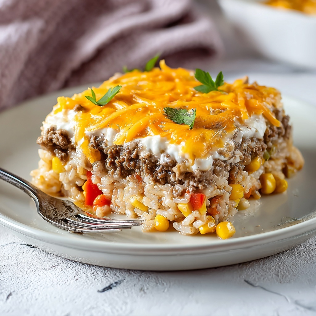 A festive and hearty Cinco de Mayo Casserole featuring layers of seasoned ground beef, refried beans, corn, flour tortillas, and melted cheese, baked to perfection and topped with fresh salsa and sour cream. Perfect for a flavorful family meal or celebration.