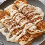 In another bowl, whisk the softened cream cheese with Greek yogurt, honey or powdered sugar, and milk until you get a smooth, luscious drizzle. Adjust the milk a little if you want a thinner sauce that can be elegantly drizzled over the rolled crepes. This topping mirrors the classic cinnamon roll icing and takes the dish to the next level of indulgence.