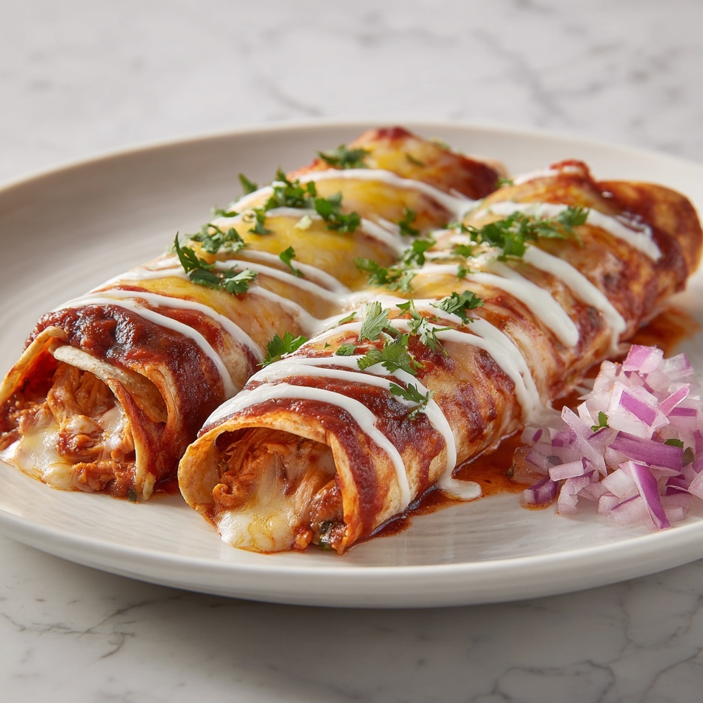 A flavorful and hearty Chicken Enchiladas recipe featuring tender shredded chicken, black beans, green chiles, and a blend of spices, all wrapped in warm flour tortillas and baked with layers of rich enchilada sauce and melted cheese. This dish is perfect for a comforting weeknight dinner or a festive gathering, served with fresh toppings like cilantro, sour cream, and avocado.