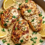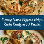 This Creamy Lemon Pepper Chicken recipe features tender, juicy chicken breasts seared to golden perfection and smothered in a luscious lemon pepper cream sauce. Infused with garlic, fresh lemon juice, and Parmesan cheese, it delivers a bright and indulgent flavor perfect for a quick weeknight dinner or elegant meal.