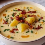 This creamy potato soup is a comforting and satisfying dish made with tender potatoes, onions, garlic, and rich heavy cream, all blended into a smooth, velvety soup. Perfect for chilly days, it’s garnished with fresh chives for a burst of flavor.
