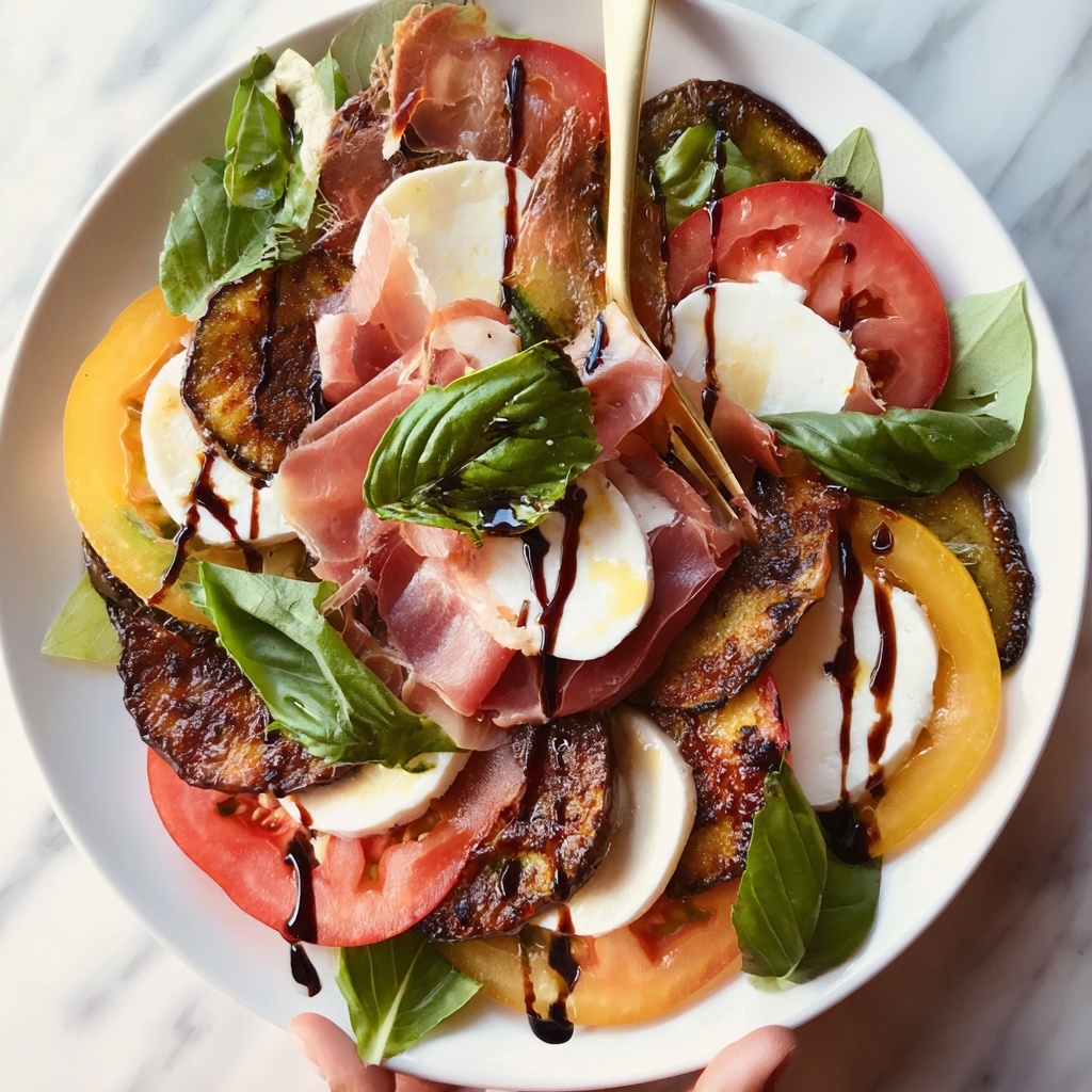 - Assemble Salad: Build the salad by layering a slice of mozzarella, a slice of heirloom tomato, a thin slice of prosciutto, and a fresh basil leaf between each crispy eggplant slice. Repeat for all slices.