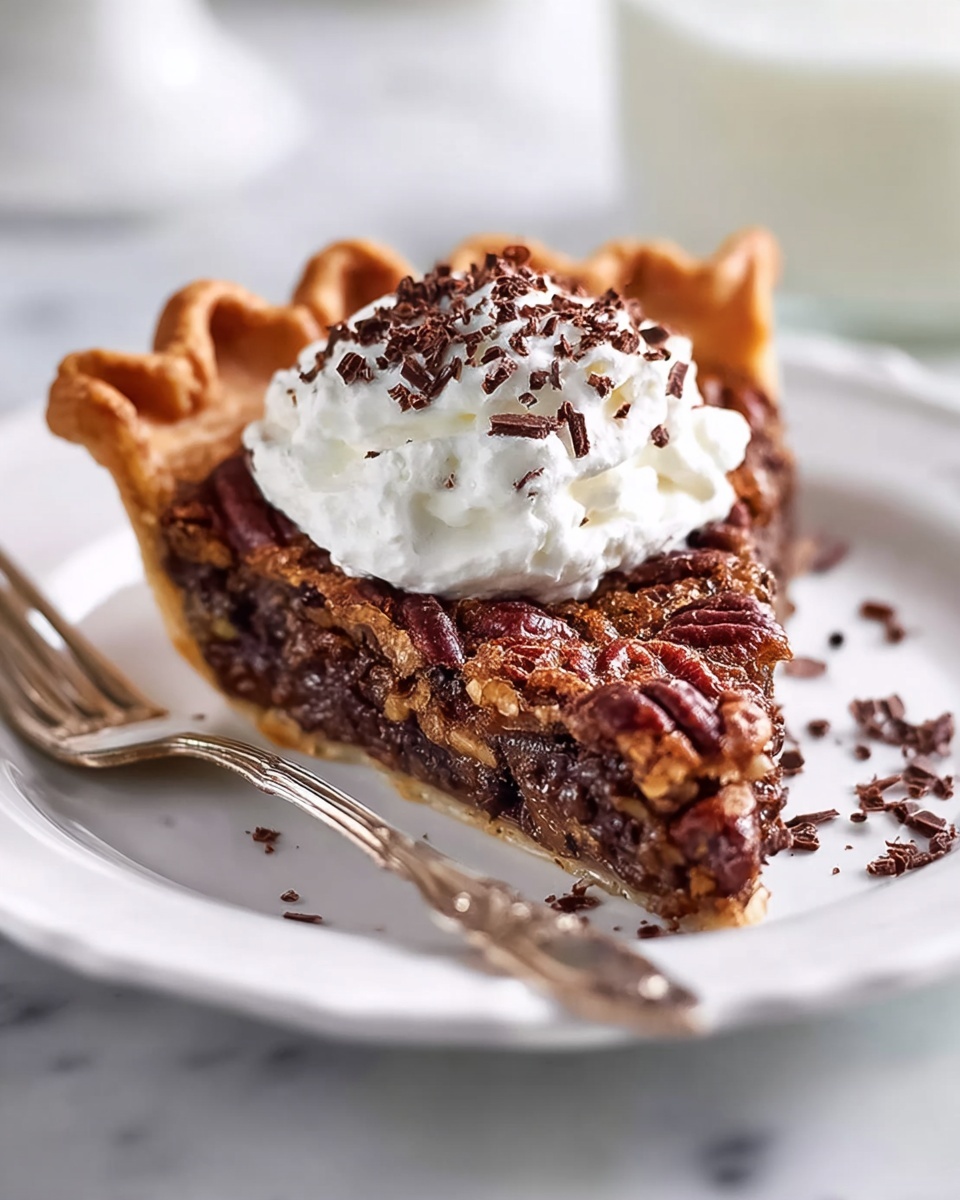 Pairing this pie with lightly roasted coffee or a smooth dessert wine can really bring out its deep chocolate and toasted pecan notes. Fresh fruit, like sliced pears or berries, also balances the richness with a refreshing, bright contrast.