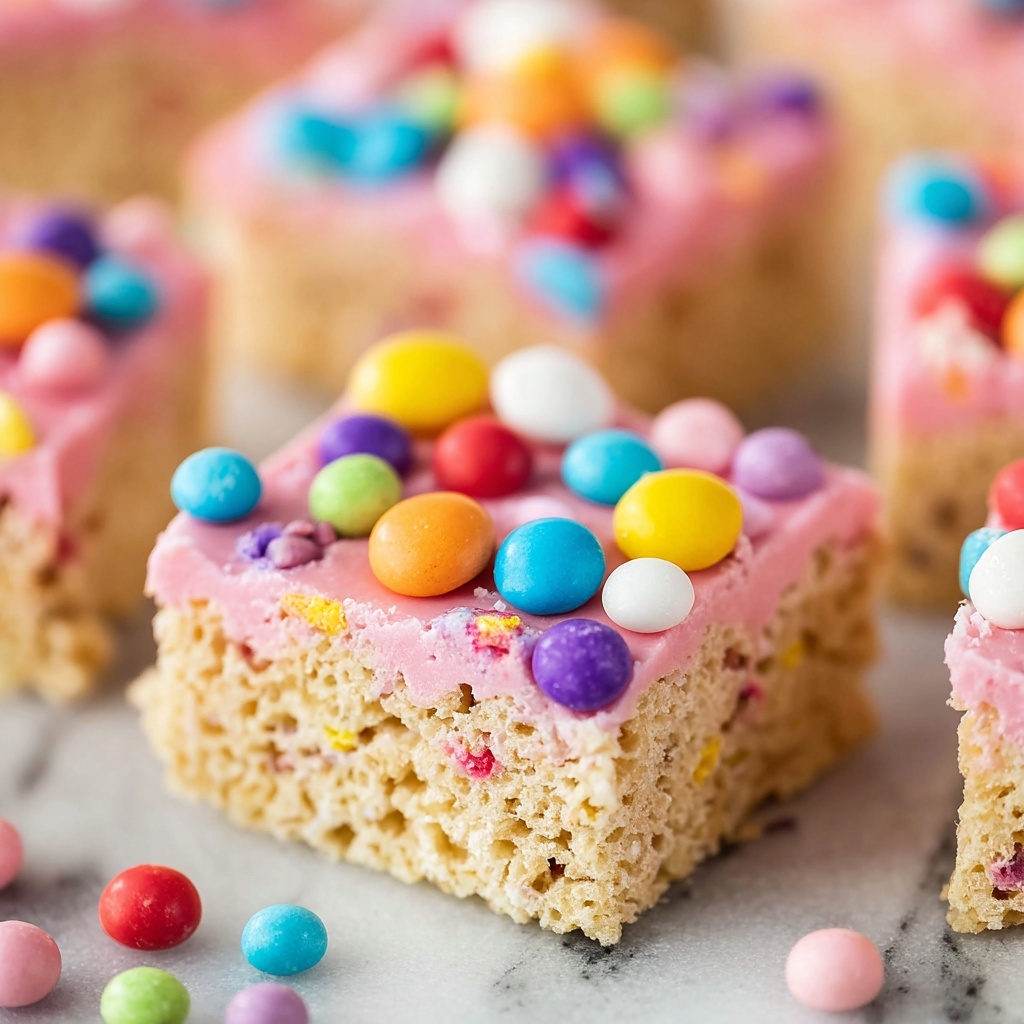 - Add Candy Eggs: Gently stir in some of the pastel-colored candy-coated chocolate eggs, reserving a few for decorating the top of the treats.