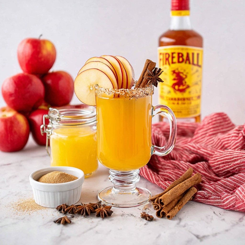 A warm, spicy cocktail combining fiery cinnamon whiskey with sweet hot apple cider, garnished elegantly with cinnamon sugar, apple slices, cinnamon sticks, and star anise for a cozy autumn-inspired drink.