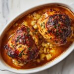 This French Onion Stuffed Chicken recipe features tender chicken breasts filled with a rich, savory mixture of caramelized onions and melted Gruyère and Parmesan cheeses. The slow-cooked onions bring a deep, sweet flavor that perfectly complements the juicy chicken. The dish is seared on the stovetop for a golden crust before finishing in the oven for a succulent, flavor-packed meal that’s perfect for an elegant dinner or special occasion.