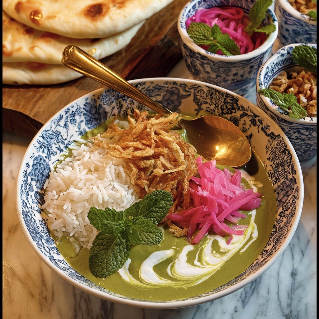 This Fresh Spinach Dahl recipe is a vibrant, creamy lentil soup packed with fresh spinach and aromatic spices. Featuring red lentils simmered with ginger, garlic, and a blend of garam masala, turmeric, coriander, and cumin, it is enriched with light coconut milk and fresh cilantro. Prepared on the stovetop and finished with a quick blend for a smooth texture, this comforting dish is perfect served with basmati or jasmine rice, and garnished with yogurt, pickled onions, and crispy fried onions for added flavor and crunch.