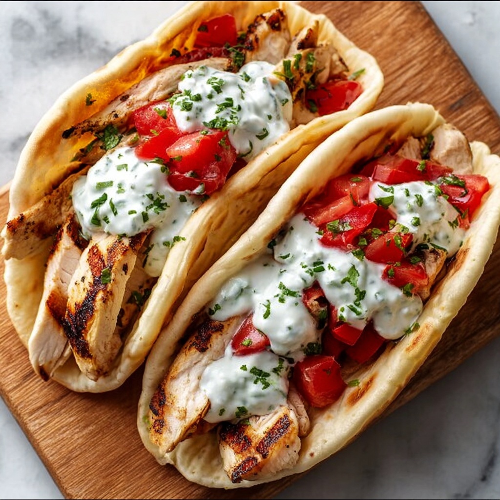When reheating, gently warm the sliced chicken in a skillet over medium heat to keep it juicy and avoid drying out. Heat pita breads separately in the oven or toaster to maintain softness. Serve with cold tzatziki straight from the fridge to preserve its creamy texture and fresh flavors.