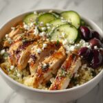 This Greek Chicken Power Bowl is a nutritious and flavorful meal packed with protein, healthy fats, and fresh Mediterranean ingredients. Featuring tender cooked chicken breast, creamy cottage cheese, fiber-rich quinoa, crisp cucumber, tangy Kalamata olives, and feta cheese, all drizzled with olive oil and seasoned with oregano, this bowl is perfect for a quick and satisfying lunch or dinner.