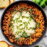 Serve your Ground Beef and Orzo Skillet Recipe piping hot. Don’t forget to sprinkle extra parmesan cheese on top and add a few fresh leaves of basil or parsley for a pop of color and freshness that brightens the dish.