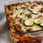 A hearty and flavorful Ground Beef Zucchini Casserole featuring layers of sautéed ground beef, fresh zucchini slices, and a rich tomato sauce, topped with melted mozzarella and Parmesan cheese. This baked casserole is a comforting and nutritious meal perfect for family dinners.