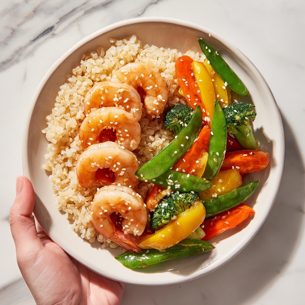 - Combine and Serve: Pour the prepared sauce over the cooked vegetables in the pan. Stir well to coat the veggies evenly with the sauce. Return the cooked shrimp to the pan and toss everything together to combine and warm through. Serve the stir-fry mixture over cooked brown rice or cauliflower rice. Garnish with sesame seeds and sliced green onions as desired for an extra pop of flavor and texture.