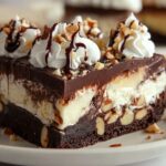 This Hot Fudge Sundae Brownie Cheesecake is a decadent layered dessert combining a rich, fudgy brownie base with a creamy cheesecake layer, all topped off with luscious hot fudge sauce, whipped cream, chopped nuts, and maraschino cherries. Perfect for special occasions or any time you crave an indulgent treat, this dessert balances chocolatey goodness with velvety cheesecake for a truly irresistible experience.