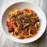 Italian Drunken Noodles is a flavorful, hearty pasta dish featuring wide pappardelle noodles tossed in a rich and spicy sauce made with browned spicy Italian sausage, caramelized onions, colorful bell peppers, garlic, white wine, and diced tomatoes. Finished with fresh herbs and olive oil, this dish offers a robust blend of Italian seasonings perfect for a satisfying weeknight dinner or gathering.