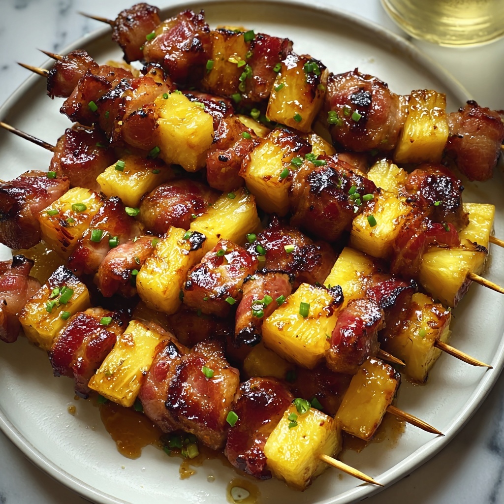 These Juicy Teriyaki Chicken Skewers combine tender chicken thighs wrapped in crispy bacon, grilled to perfection with sweet pineapple chunks and homemade teriyaki sauce for a flavorful and satisfying meal perfect for any barbecue or casual dinner.