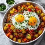 Top the sizzling hash with the fried eggs and sprinkle with fresh chopped parsley for a burst of color and freshness. Serve your Loaded Breakfast Hash Recipe hot and enjoy the satisfying combination of flavors and textures in every mouthful.