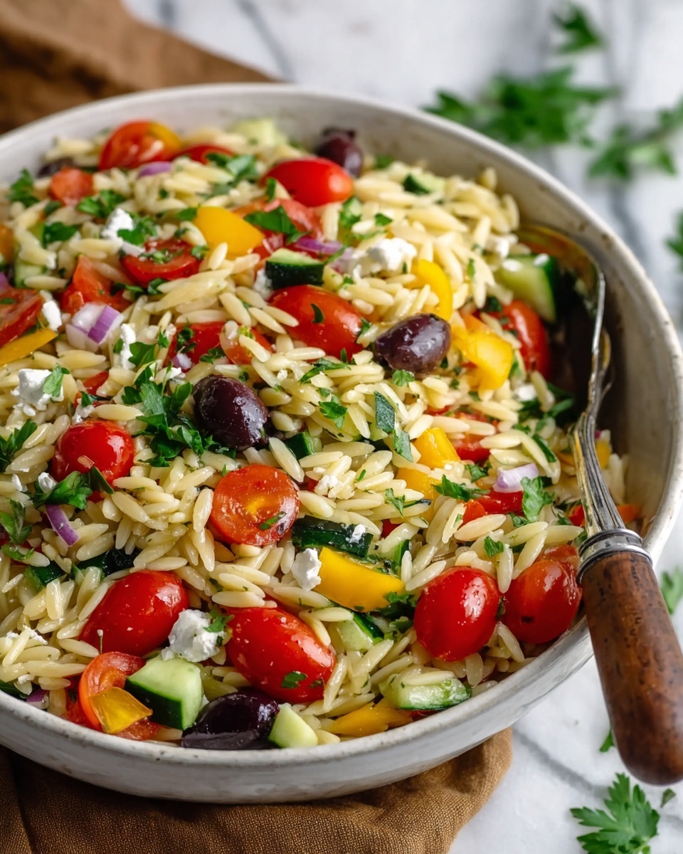 A refreshing and easy-to-make Orzo Pasta Salad featuring tender orzo pasta combined with crisp vegetables, tangy feta cheese, and a vibrant olive oil and red wine vinegar dressing. Perfect as a light lunch or a side dish for any meal, this salad is flavorful, colorful, and ready in just 20 minutes.