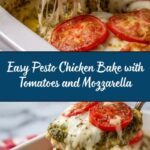 A delicious and easy Pesto Chicken Bake featuring tender chicken breasts topped with garlic, fresh tomatoes, and melted mozzarella cheese, all baked to perfection for a flavorful and satisfying meal.