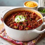 The joy of this chili extends beyond the pot. Toppings such as a generous dollop of sour cream add a cooling contrast to the chili’s warmth, while shredded cheese melts ever so slightly into each bite, creating silky, rich pockets of flavor. Freshly sliced green onions lend a crisp, bright note that lifts the whole dish.