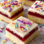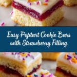 These Poptart Cookie Bars combine the best of flaky, buttery cookie layers with a sweet strawberry preserves filling, topped with a luscious vanilla glaze and colorful sprinkles. Perfectly chewy with a melt-in-your-mouth glaze, these bars are a nostalgic treat that replicates the classic pop tart flavors in a handheld dessert bar.
