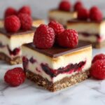 After the bars have cooled at room temperature, transfer them to the fridge and chill for at least 3 to 4 hours, or ideally overnight. This chilling step firms up the cheesecake to the perfect consistency for slicing. When ready to serve, cut into squares and, if you like, top with fresh raspberries to add an extra pop of fruitiness and charm.