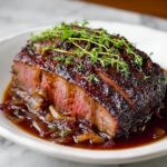 This Red Wine & Gelatin Jus Brisket is a savory and tender slow-cooked beef dish, enriched with a rich red wine and gelatin jus that enhances the meat’s natural flavors. Perfectly seared and oven-braised with aromatic vegetables and garlic, this recipe yields a succulent brisket ideal for a comforting dinner.