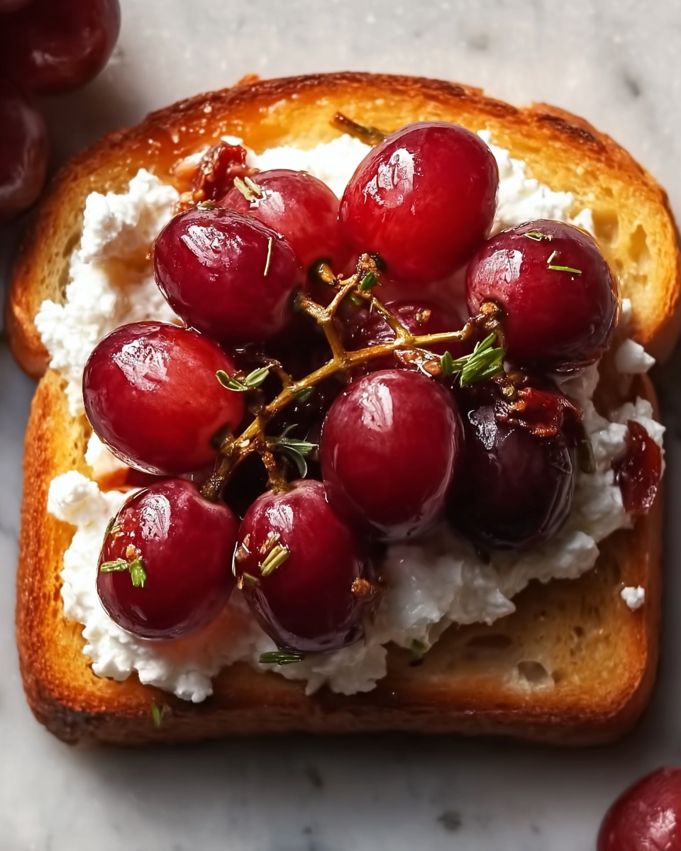 - Assemble the Toasts: Spread a generous layer of ricotta mixture on each toasted bread slice, then top with the roasted grapes and their juices.