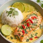 This Salmon Coconut Milk Curry is a creamy, flavorful dish featuring tender salmon fillets cooked in a rich coconut milk curry sauce infused with aromatic spices. Perfectly paired with steamed rice and garnished with fresh cilantro and lime, this easy-to-make recipe offers a delightful blend of savory and mildly spicy flavors ideal for a satisfying weeknight meal.
