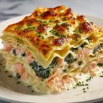 This Salmon Spinach Lasagna is a delicious twist on the classic Italian favorite, combining tender layers of lasagna noodles with a flavorful filling of cooked salmon, fresh spinach, and creamy ricotta cheese. Topped with a rich homemade white sauce and melted mozzarella, this comforting dish bakes to golden perfection. Ideal for family dinners, it offers a balanced blend of protein, greens, and cheesy goodness.