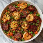This Sausage, Shrimp, and Rice Skillet is a hearty one-pot meal blending smoky turkey kielbasa, succulent shrimp, and tender rice cooked with vibrant bell peppers, cherry tomatoes, and aromatic spices. Perfect for a flavorful and comforting dinner that comes together easily on the stovetop.
