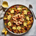 This classic Spanish Seafood Paella combines succulent shrimp, mussels, and calamari with flavorful Arborio rice infused with saffron, smoked paprika, and garlic. Cooked in a wide skillet, this vibrant one-pan dish showcases a perfectly tender rice base with a crispy socarrat bottom, garnished with fresh lemon and parsley for a bright finish. Ideal for a hearty main course, it captures the essence of Spain’s coastal culinary tradition.