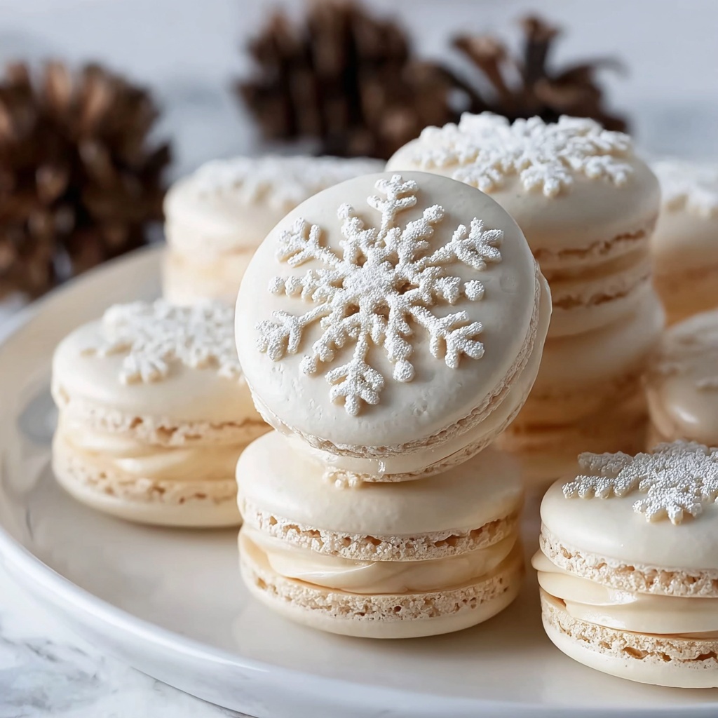 - Decorate: Using royal icing or melted white chocolate, pipe delicate snowflake designs on top of each macaron. Sprinkle with edible glitter or pearl dust for a festive touch. Allow the decorations to set before serving.