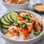 Divide the cooked jasmine rice into two bowls, creating that comforting bed for your salmon. Gently place the cooked salmon on top, letting it shine as the centerpiece. Arrange thin cucumber slices alongside for crunch and freshness. Drizzle your spicy mayo sauce generously over the salmon and cucumber, then sprinkle chopped green onions and toasted sesame seeds on top for that perfect final touch that will make your Spicy Salmon Rice Bowl Recipe visually stunning and delicious.