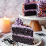 This Spooky Black Velvet Halloween Cake is a moist, rich black cocoa dessert perfect for Halloween celebrations. Featuring dark black cake layers tinted with black food coloring, it’s frosted with creamy buttercream and decorated with festive Halloween sprinkles, edible glitter, and fun plastic spider rings for a hauntingly delightful treat.