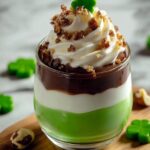 Celebrate St. Patrick’s Day with this festive and delicious layered parfait featuring vanilla pudding, lime gelatin, whipped cream, and crunchy graham crackers or granola. Garnished with green candies and chocolate shavings, this no-bake dessert is easy to assemble and perfect for serving 4-6 guests.