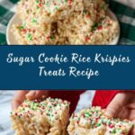 Delightfully festive and chewy Sugar Cookie Rice Krispies treats bursting with the classic flavors of sugar cookies combined with the crispy crunch of Rice Krispies cereal and gooey marshmallows, topped with colorful sprinkles for a perfect holiday or anytime snack.