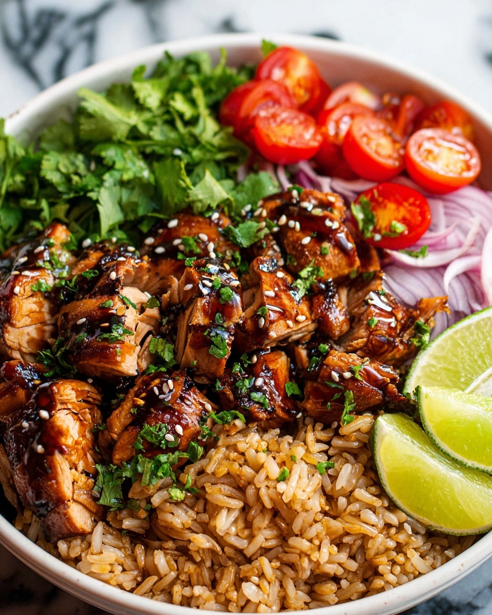 - Garnish and Serve: Sprinkle sesame seeds over the top and garnish with fresh cilantro leaves if desired. Serve immediately to enjoy the contrast of warm chicken and crispy rice with fresh veggies.