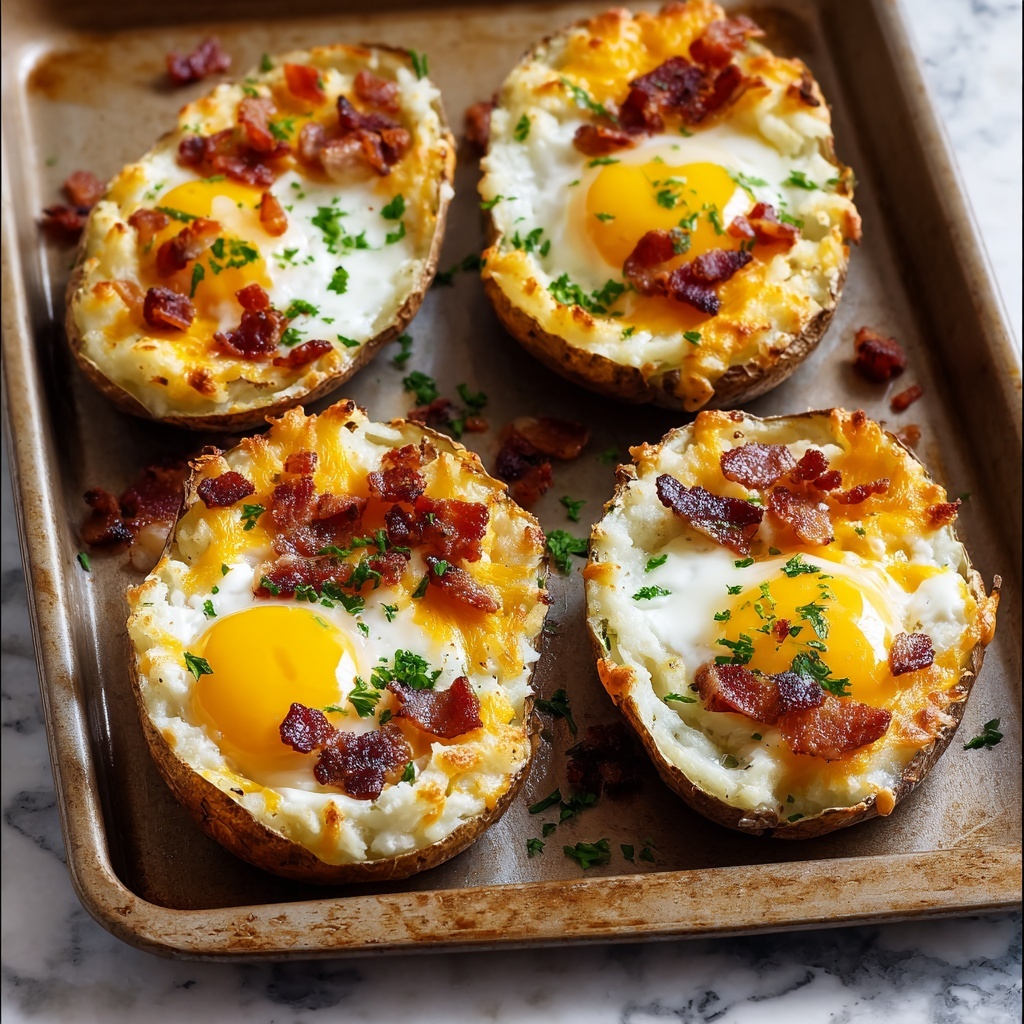 Twice Baked Loaded Breakfast Potatoes are a hearty and delicious morning meal featuring tender baked russet potatoes filled with a creamy mixture of mashed potato, crispy bacon, cheddar cheese, and green onions, topped with a perfectly baked egg. This recipe combines savory flavors and satisfying textures, perfect for a comforting breakfast or brunch.