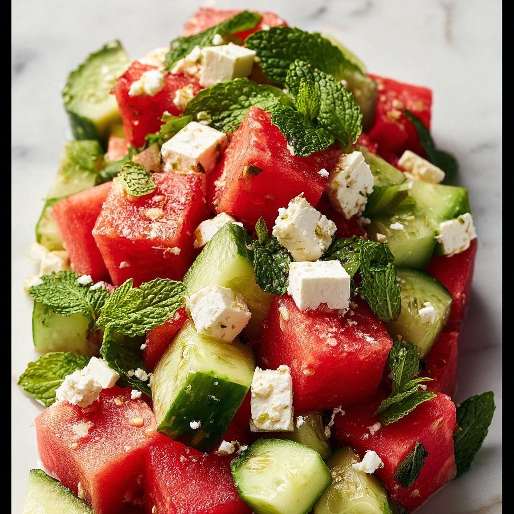 A refreshing Watermelon and Feta Salad that combines juicy, sweet watermelon cubes with crisp cucumber, tangy feta cheese, and fresh herbs. Tossed in a simple olive oil and red wine vinegar dressing, this salad is perfect for a light appetizer or side dish on warm days.