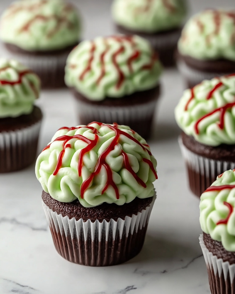 To enhance the spooky vibe, consider adding a few edible “eyeballs” made from candies or small marshmallows alongside the cupcakes. Sprinkling a little edible glitter or green sugar crystals on the frosting can also add a sparkling brain effect that’s perfect for parties.